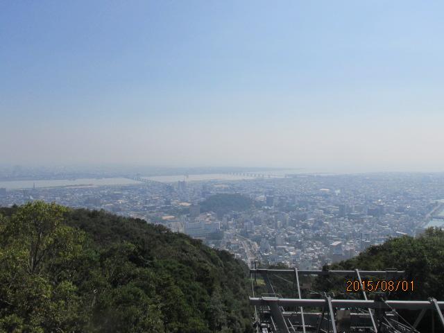 標高277mからの眺め。市内はほぼ海抜数mの平地だから、ほぼ300mの高度差が楽しめる。東京タワーの展望台100mの3倍、新東京タワー・スカイツリーの第一展望台、340mにほぼ匹敵する位の高さだ。眼下に徳島の街並み、昔は阿波の国と言われた一国全体が、そして右手南方には小松島の島並とその先の紀伊水道、左手眼下には大河・吉野がゆっくりと蛇行している。モラエスはここまで登らなかったとしても、阿波の殿様、蜂須賀公は来たに違いない。吉野に育まれた阿波一国の殿様として、大いなる満足を味わったことだろう。