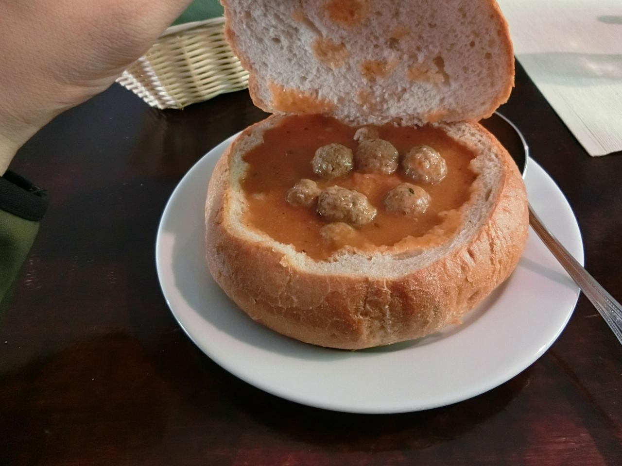 パンをくりぬいてミートボールのグラーシュを入れたもの。味はイマイチ...。