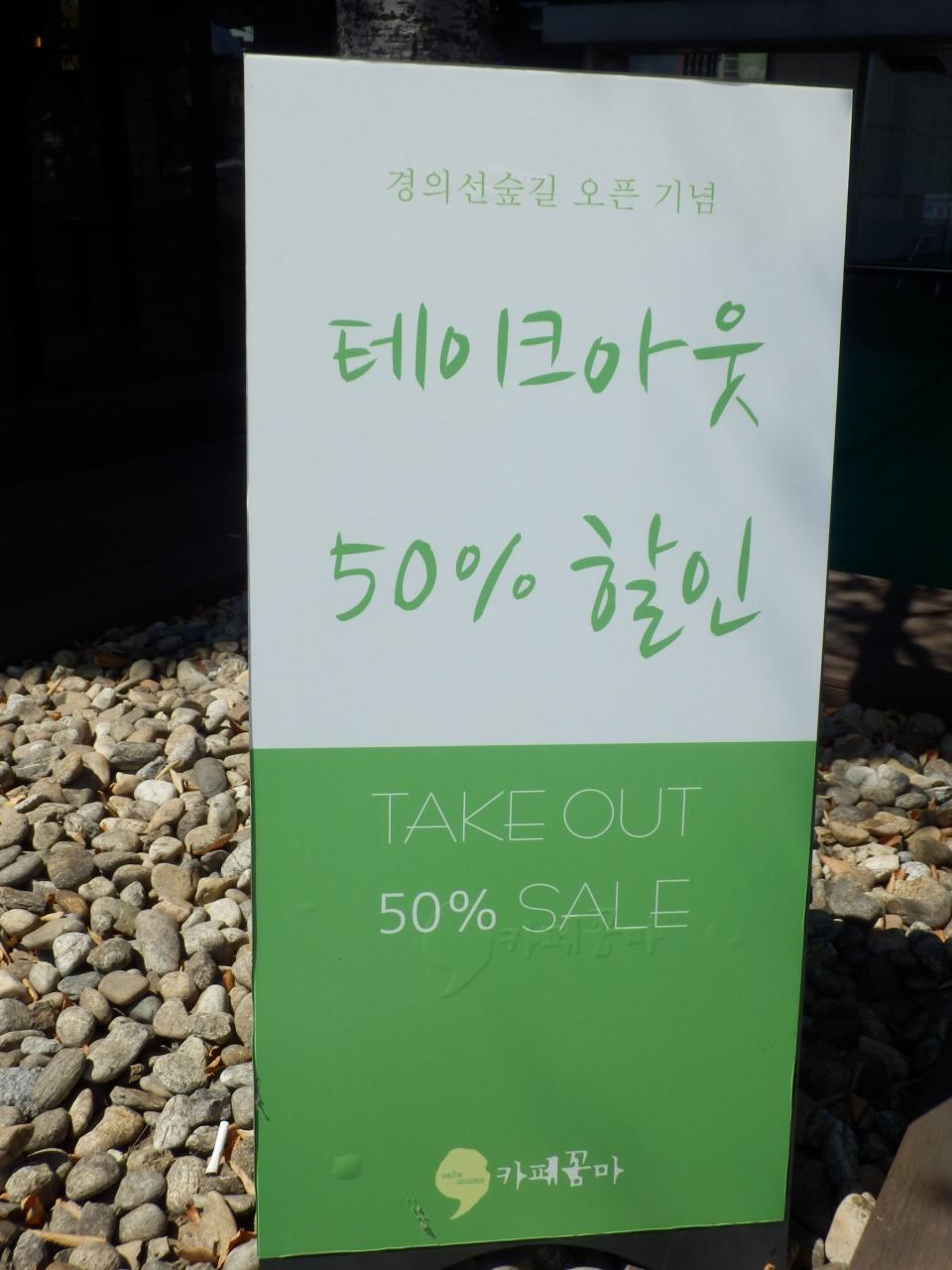 韓国語で「テイクアウト 50パーセントオフ(割引)」と書かれています。