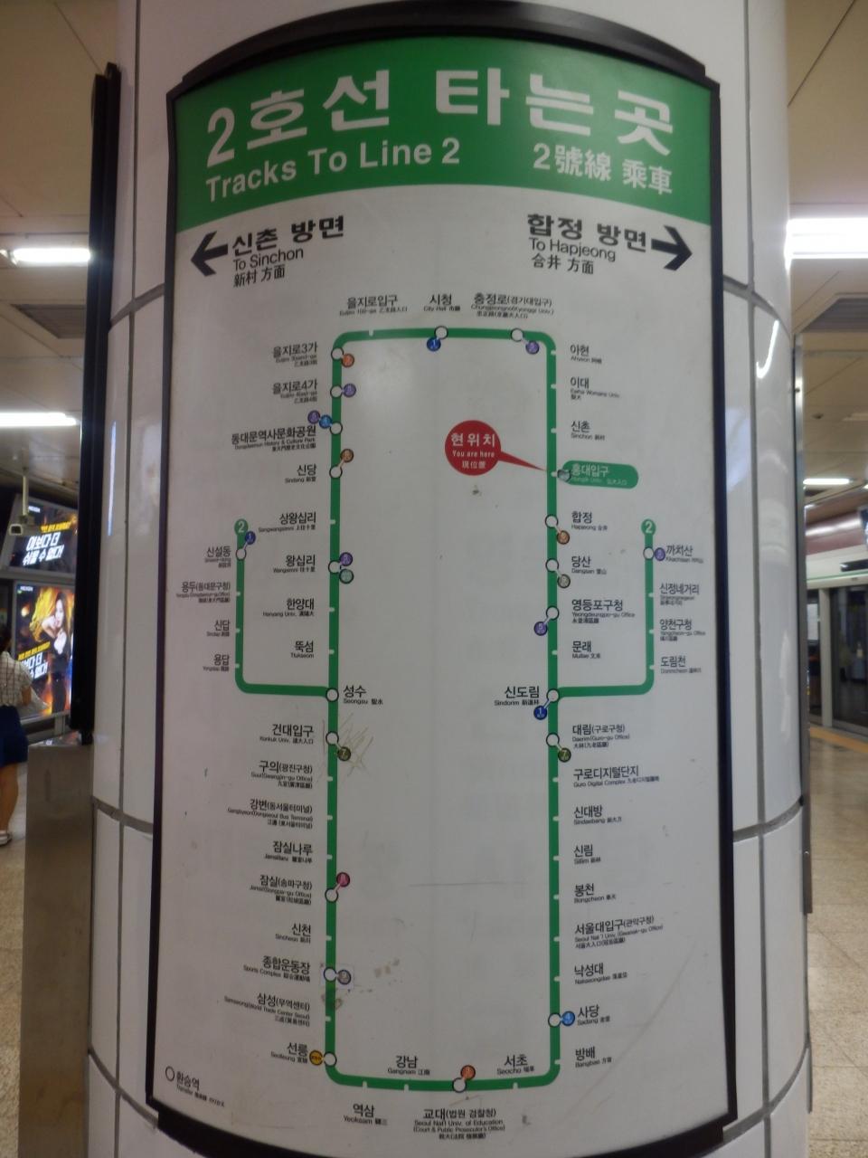 駅ホームです。最初の目的地 弘大入口まで普通列車で行きました。