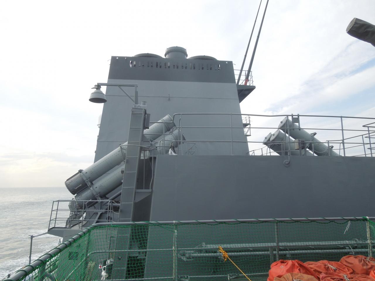 右舷の甲板に無造作に積まれている魚雷の3連装発射管