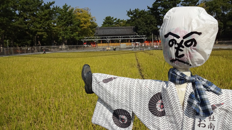 住吉さんへお参りする前に、境外末社「浅澤神社」へ。なんでも芸事の神様と云うことで、芸能人の提灯が沢山。次に大社内の「御田」(おんだ)へ、稲穂が頭を垂れており収穫期を迎えているようです。幾ら御田と云えども雀攻撃はあるようで、案山子がお守りされていました。