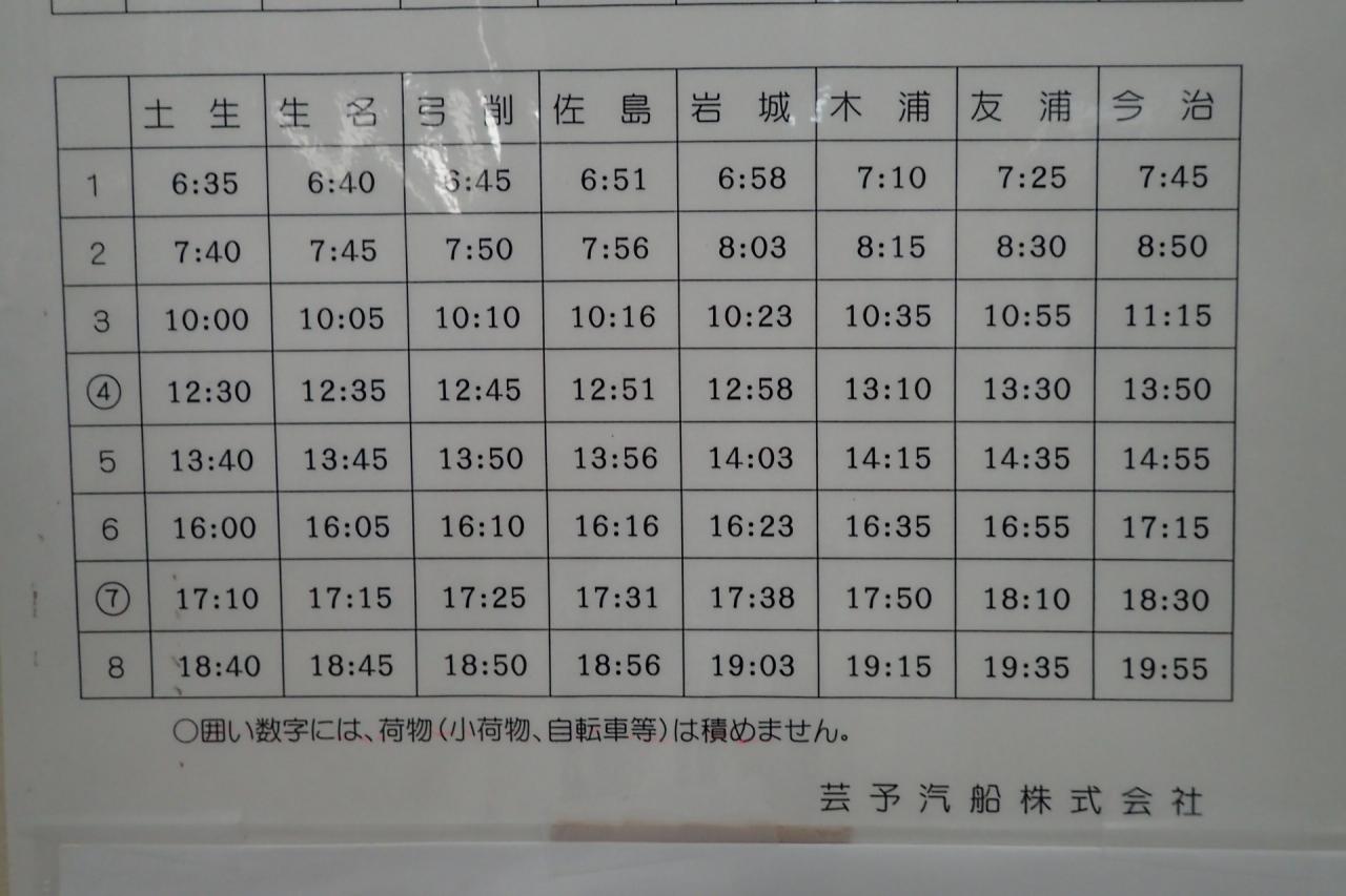 定刻より2分くらい早く土生港に到着しましたが、傘が有っても歩けないくらい激しい雨でした。島で雨に見舞われると完全にアウトです。この島は船の乗り継ぎのためだけの経由地に過ぎませんので仕方ないと思いながら次の船を待ちました。