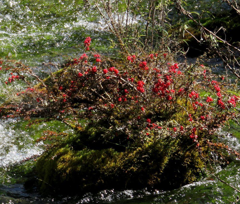 木道の上から下流を撮影。水辺には赤い実をつけた低木が多く見られた。