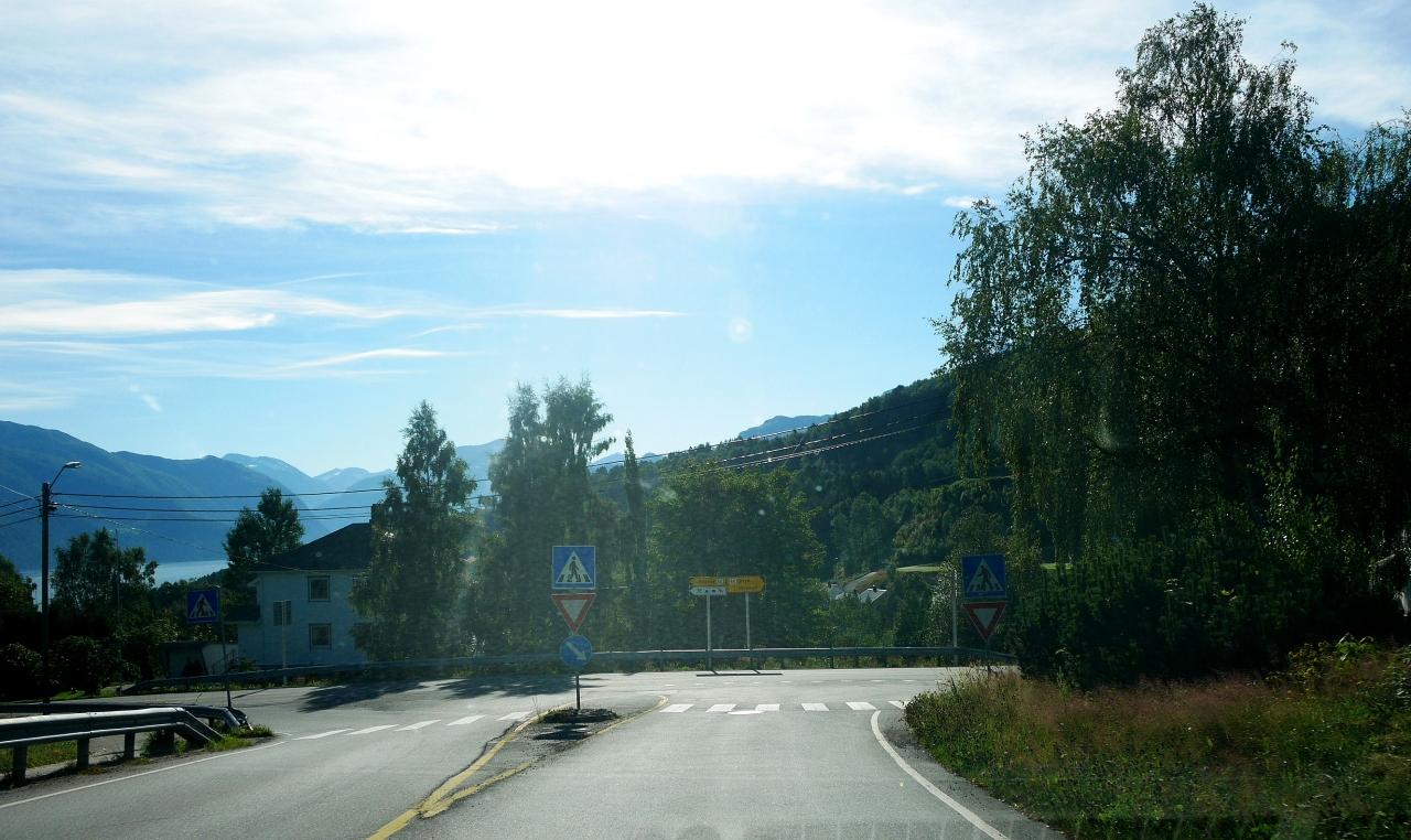 E39号線 湖が土手になってE39号線は右に,国道15号線で左折してStrynに