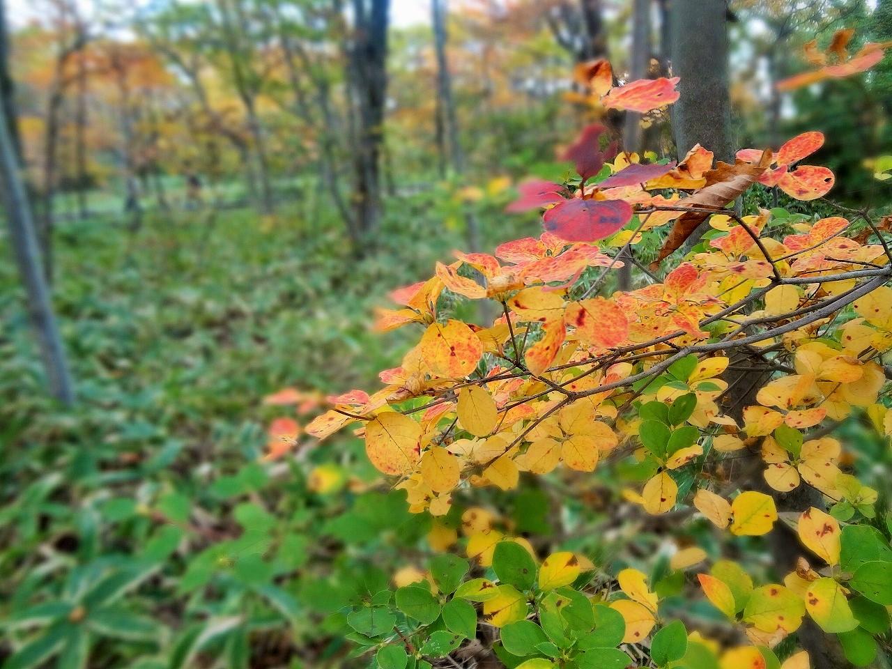足元には赤色や茶色の落ち葉が広がっています。 -