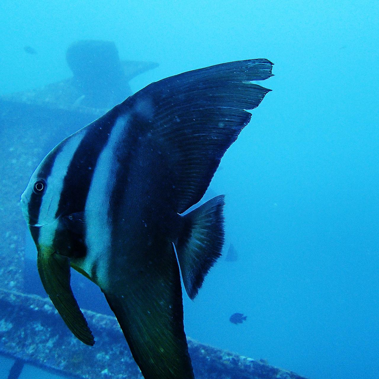 このエリアの特徴は沈船と、水中に沈められた原付にまたがって記念撮影が出来ること。