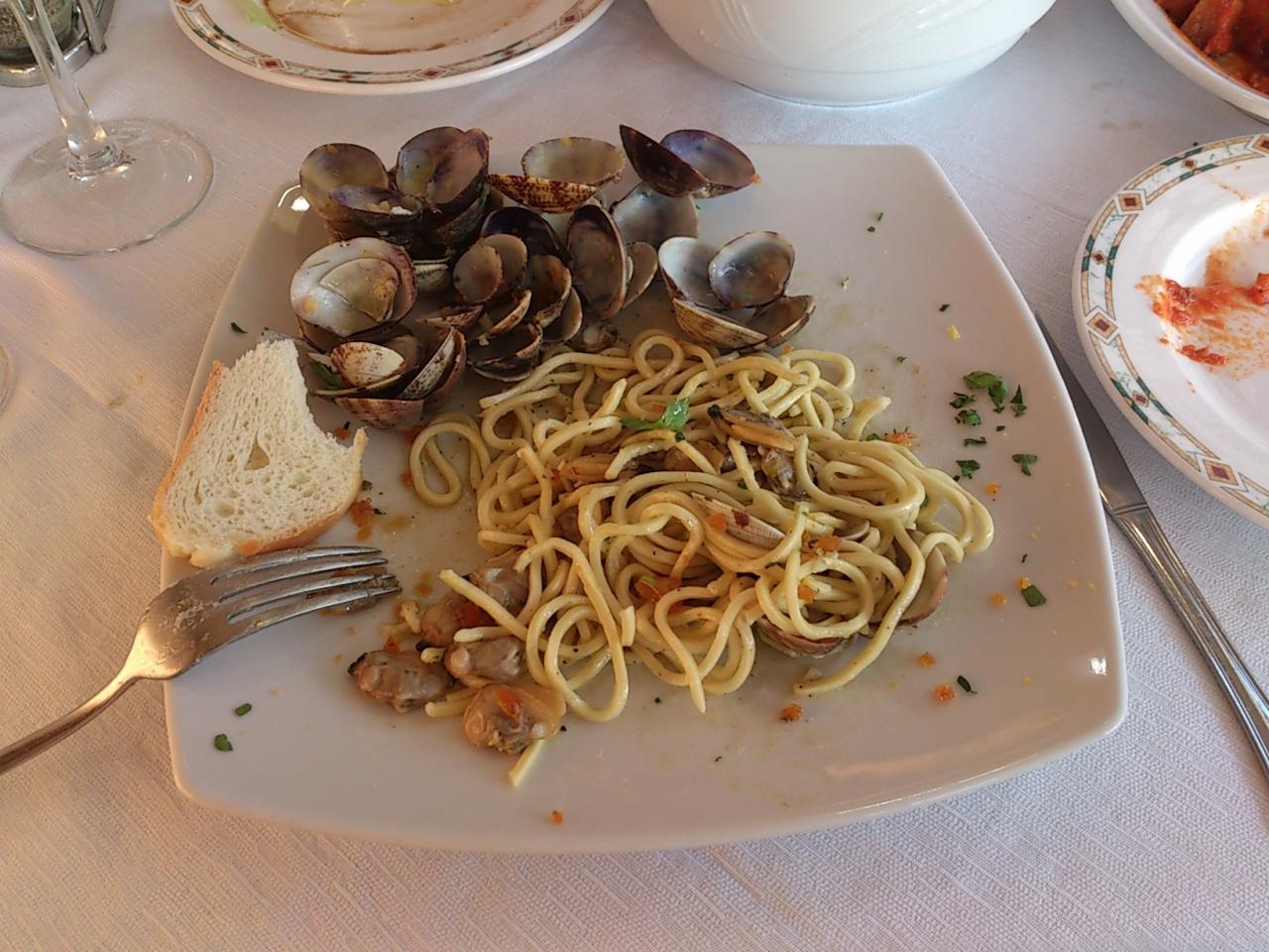 お昼が遅かったので野菜とパスタだけのディナーです。生パスタのボンゴレです。殻を外した写真しかありませんが、とにかくおいしかったです。夫はエビのラビオリでした。