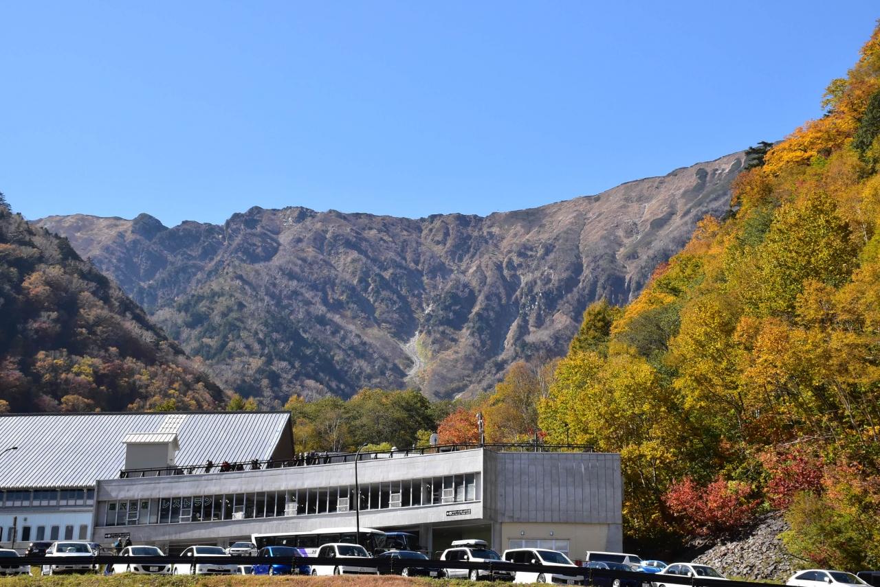 信濃大町からバスに乗り、黒部ダムの玄関 扇沢トロリーバス駅に到着すると、まわりの山々が美しい彩りで色づいています。