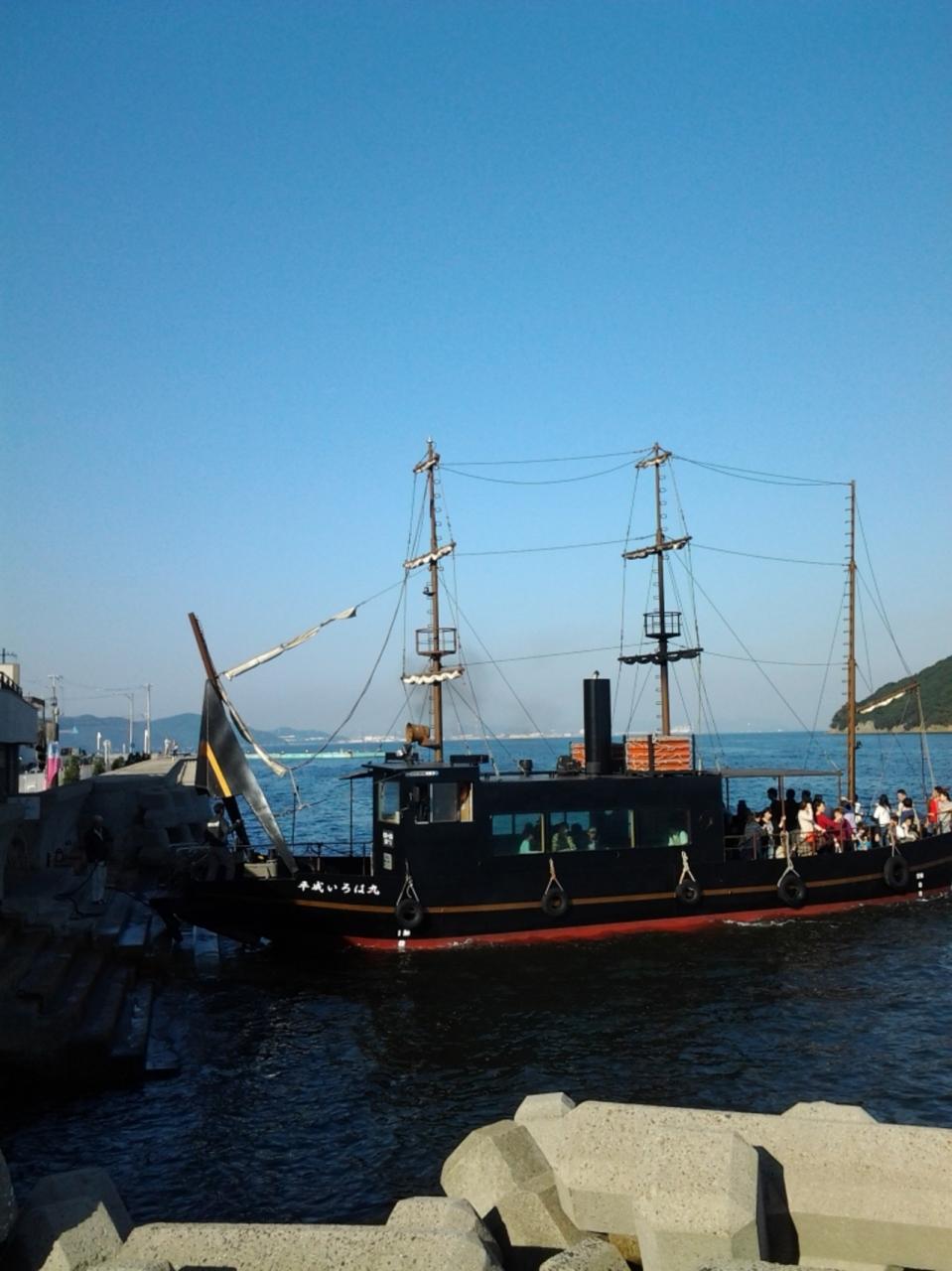 いろは丸を模した船が仙酔島への定期船の役割をしています。 -