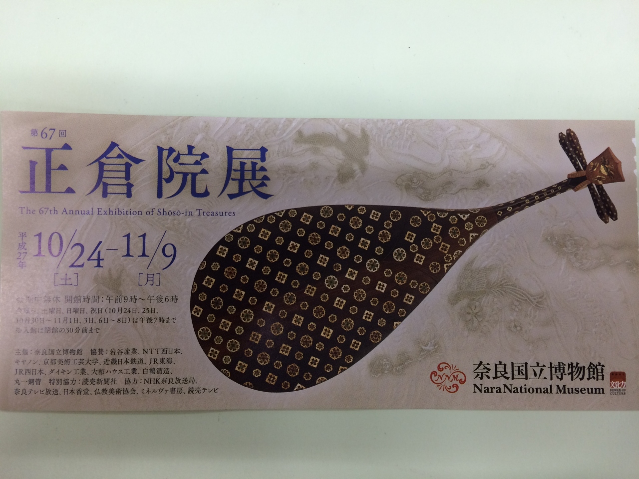 この時期の恒例行事と言えば、奈良国で開催される「正倉院展」です。大学1回生から10年以上毎年行ってます。昨年は「鳥毛立女屏風」という目玉がありましたので、今年は「琵琶」など万人受けしやすい楽器類が多数ありましたが、全体的にはややおとなしめでした。個人的には文書部門(特に計帳)がグッとくる感じでした。