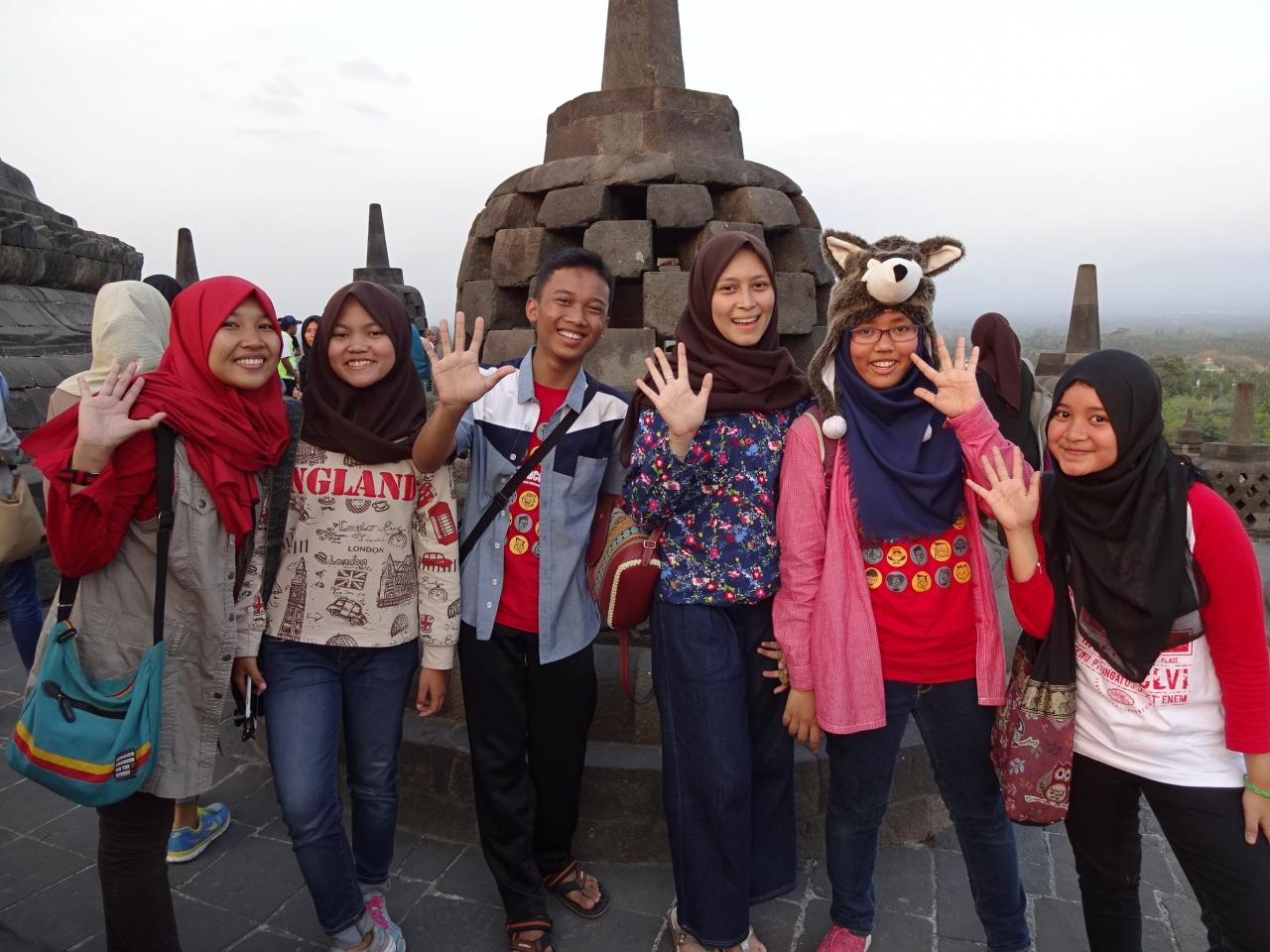 結局4回くらいインタビューを受けました。さっきもいた子もいるね。何人か日本語での自己紹介をマスターしている子がいてびっくりしました。しかし後でインタビューについての発表とかがあるんだとしたら、この班もこいつ(私)か、回答ワンパターンなんだけど…とならないかちょっと心配。実際この時ボロブドゥールにいた観光客はインドネシア人が圧倒的多数で、外国人はそれ程多くありませんでした。日本人も全然見かけなかったんですが、翌朝のサンライズツアーでは状況が一変します。