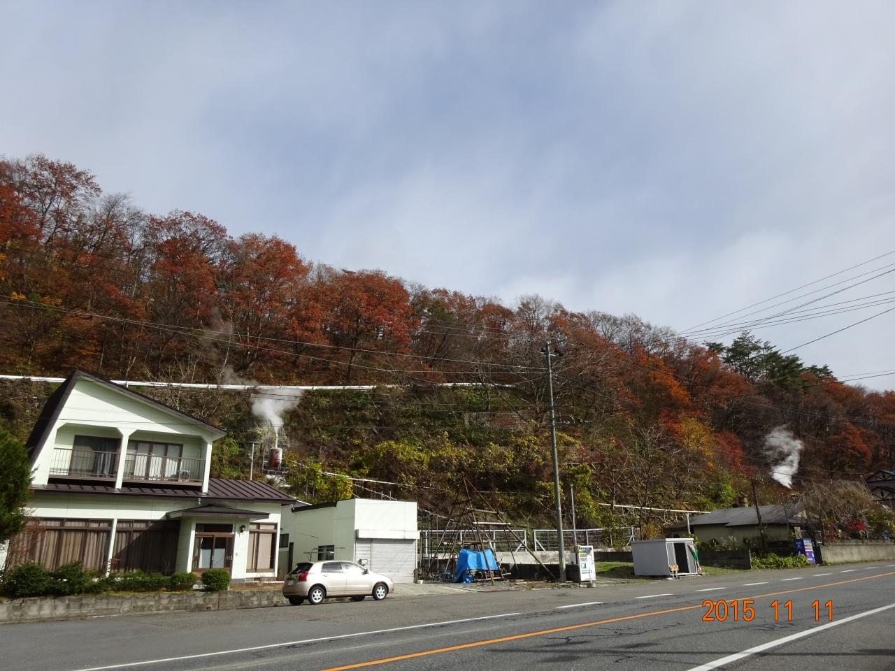 自然に囲まれたのどかな道を歩くと・・・大谷川に沿って白い湯煙が上がる様子を随所で見ます。