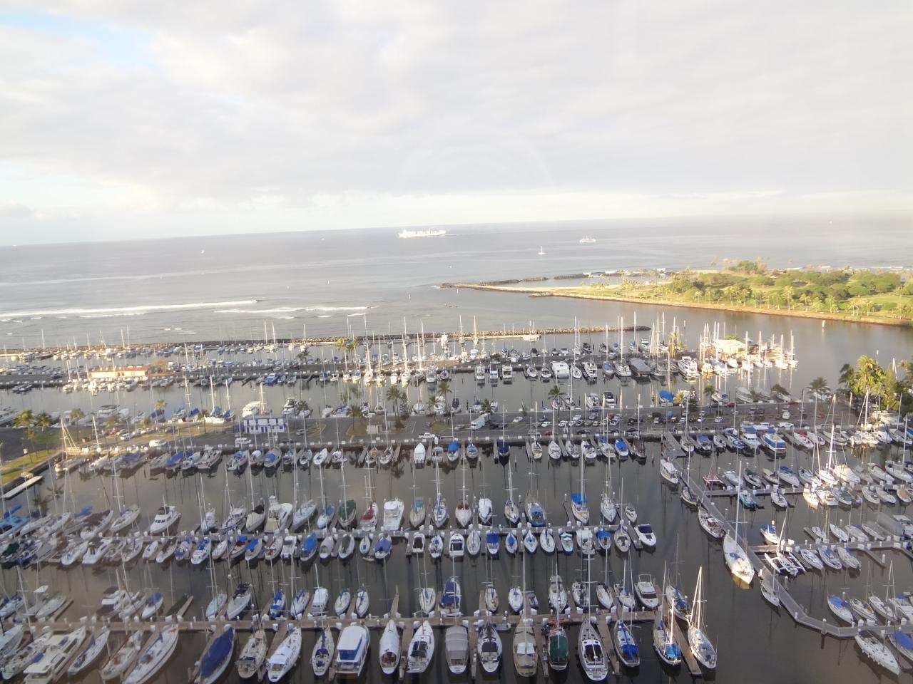 朝、大きな窓からアラワイヨットハーバーが下に見えます。