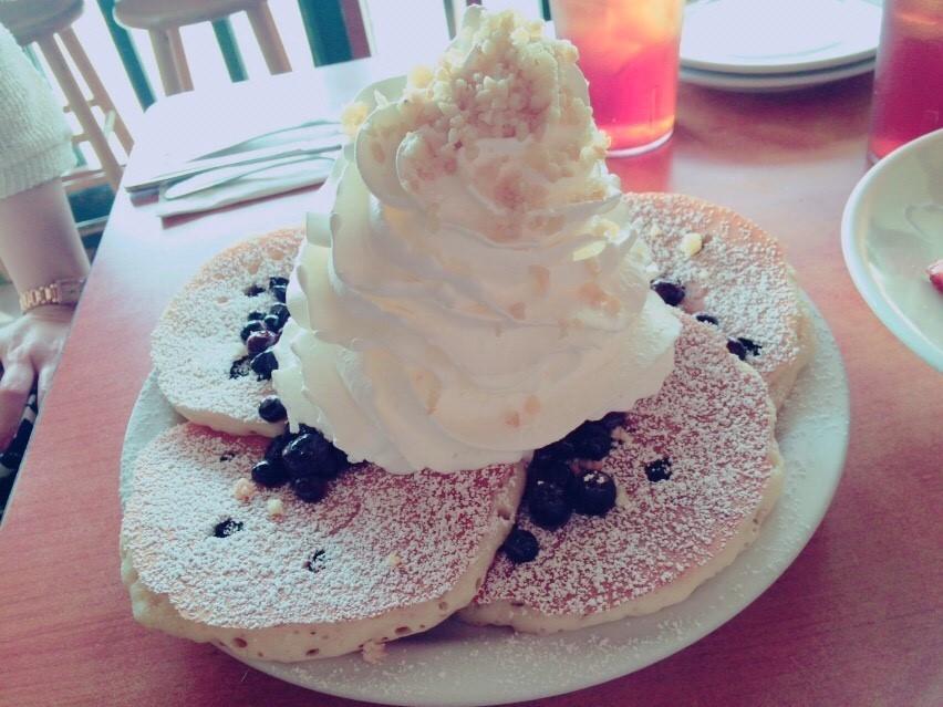 ブルーベリーにホイップクリームとマカダミアナッツのパンケーキとロコ・モコを頼みました。