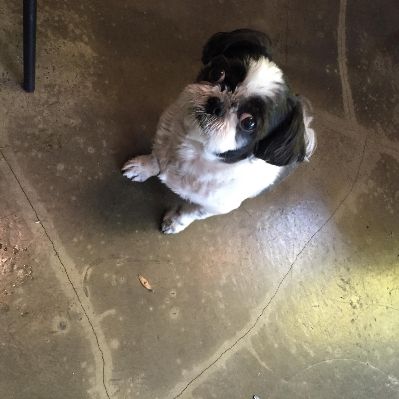 ペンションの犬がおねだりにきました。サバの煮つけを上げるとぺろりとたいらげました。