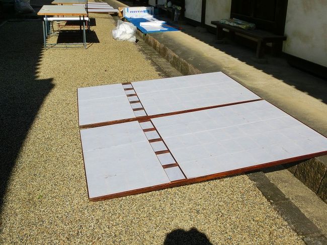 聖霊院のとなりで障子張りをしていました