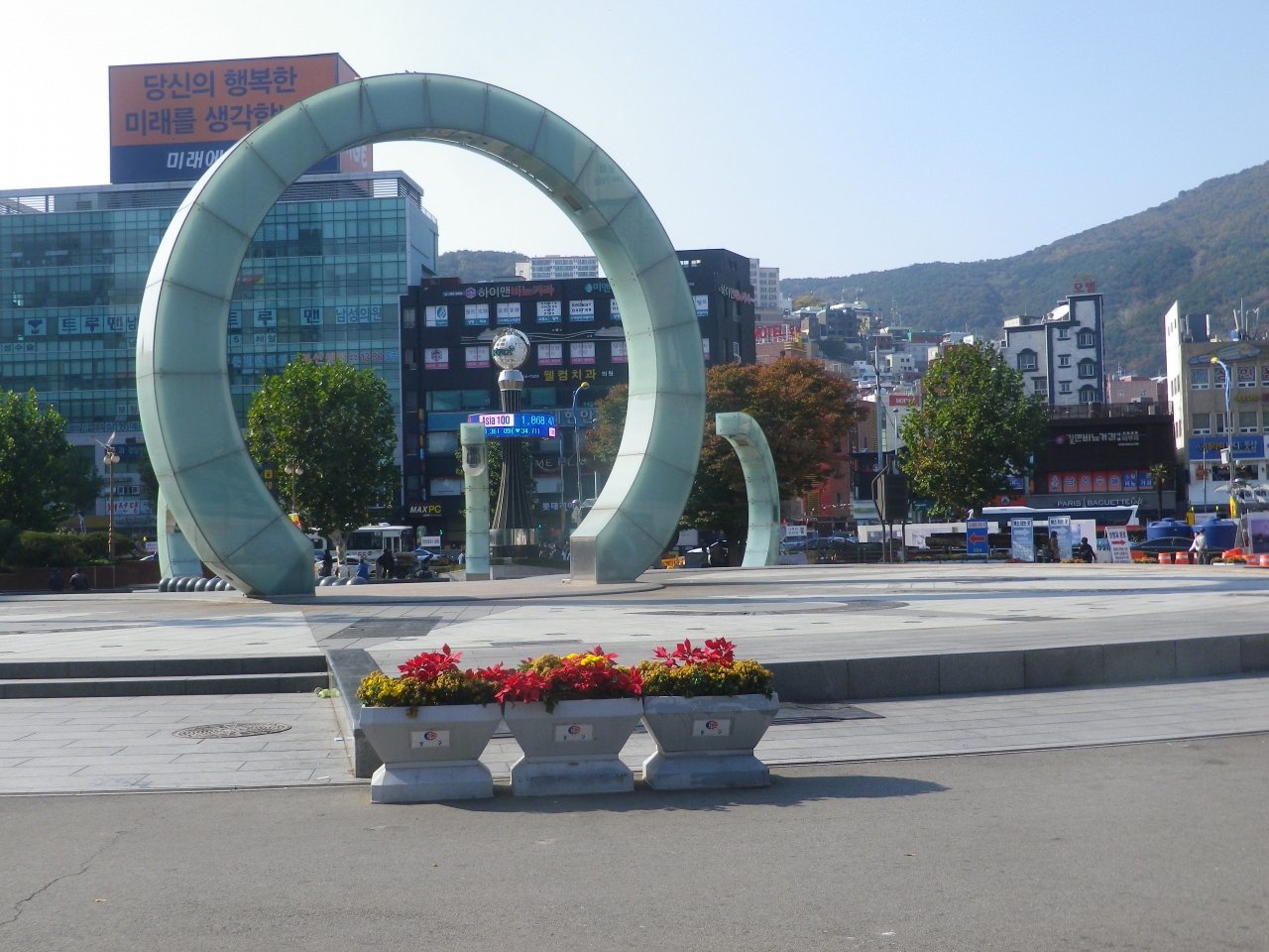 釜山駅前広場、花壇や噴水があり、夜はネオンが点灯して綺麗です