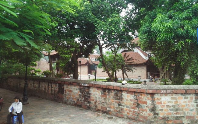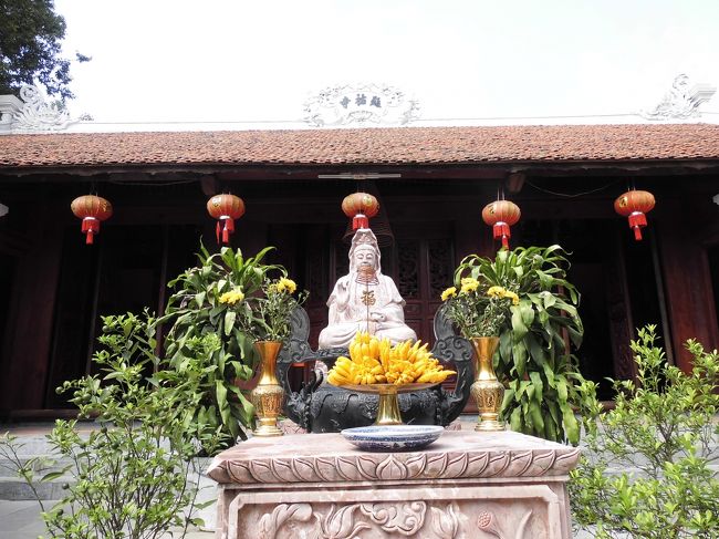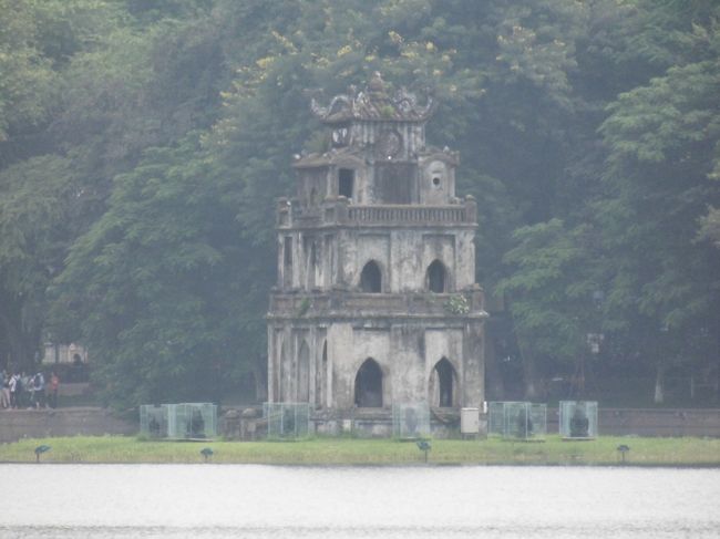 2日目ハノイ市内観光に出発 ゴールドの亀の横でたんちゃんが説明をしてます
