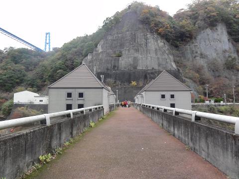 ハイキングはここで半分、ここから第一駐車場までが辛い道でした。ダムへは車でも来られ、吊橋を見上げながら周辺散策も出来るようです。それなら膝も痛めません。 -