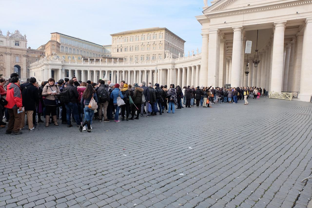 サン・ピエトロ大聖堂に到着すると、約400名ぐらいがセキュリティチェックを待っています。ゲートが4つ稼働しているのでゲートあたりだいたい100人待ちです。