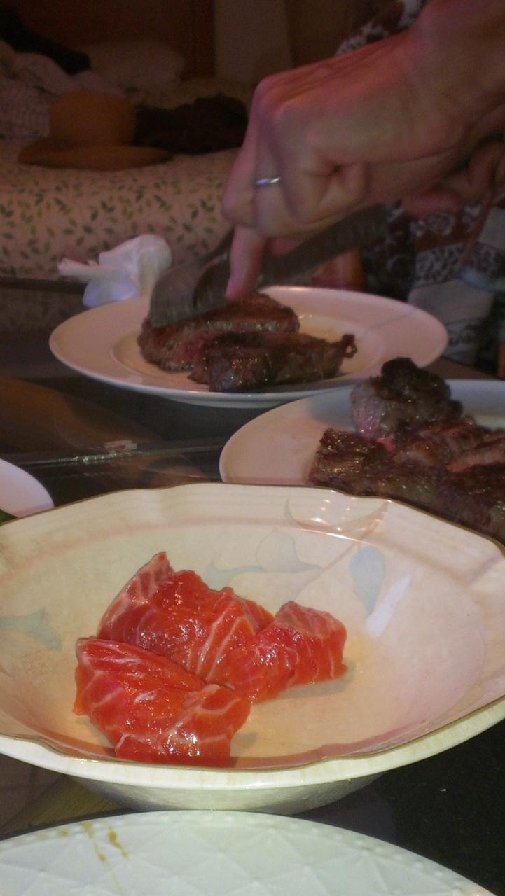 今夜はコスコの高いコーナーのステーキ肉とサーモンのお刺身。