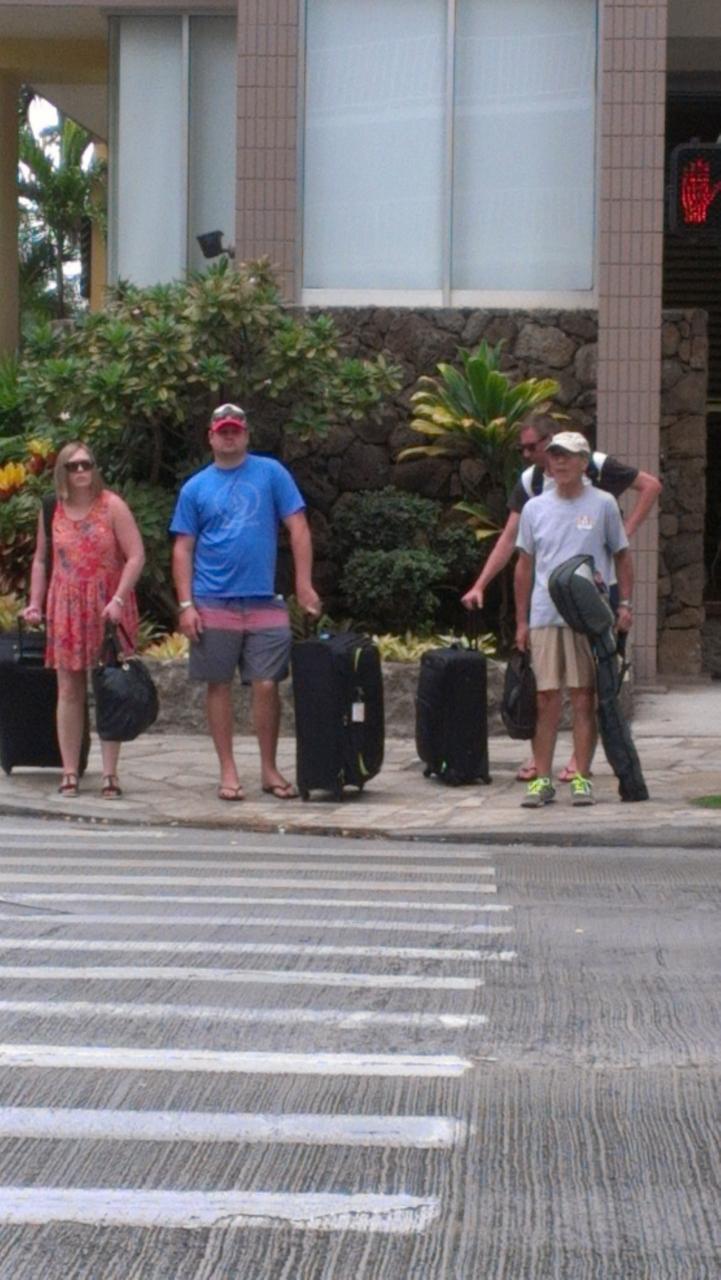 おー やっぱり夫婦だねー。朝のフラの練習終えてホテルに渡る歩道で・・・わが夫がゴルフのセット持って立ってます。