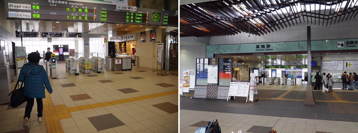 左はキップを渡して改札口を通ります。右は自由通路から見える高岡駅の改札口です。