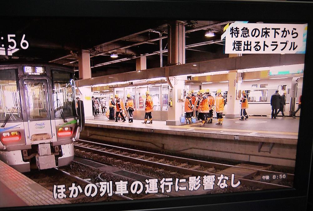 8時30分頃特急列車が7番ホームへ入線してきてから、車体の床下から煙が出ました。この時、私は階下のコンビ二へカップコーヒーを買いに行っていまして、詳細は知らなかったのです。カミさんと孫息子はホームのガラス張り待合室に居ました。特急列車が入って来た後に煙が出だし、ゴムの燃えるような匂いがしたので避難して来たと言っていました。