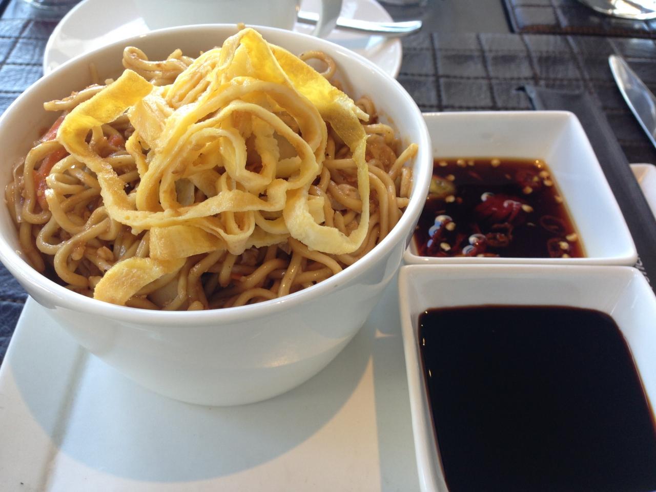 ミーゴレン。奥のピリ辛ソースが美味しいです。