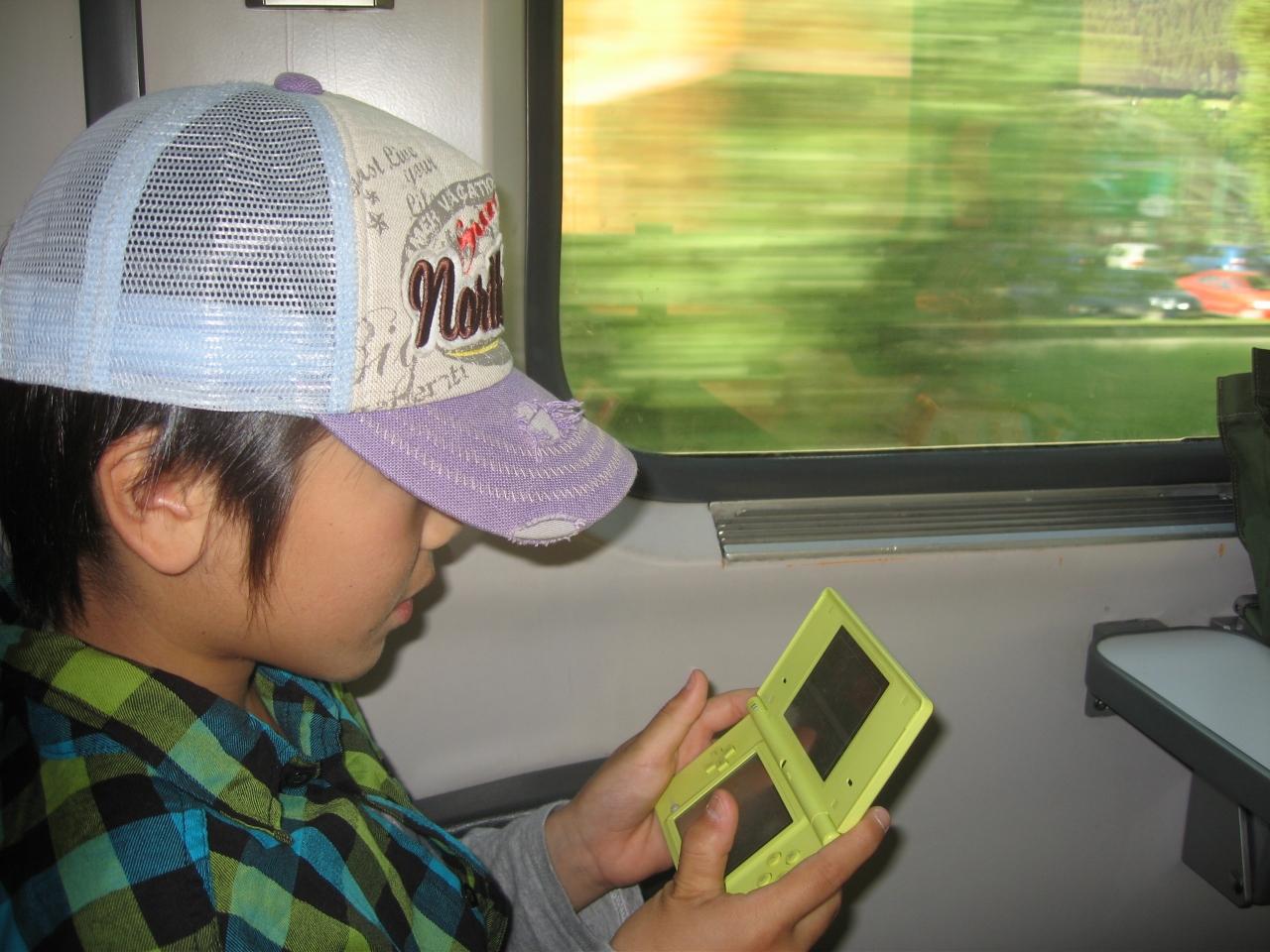 チロルとは違うであろう車窓の景色を見せたかったのに、孫たちはゲームや折り紙に夢中です。
