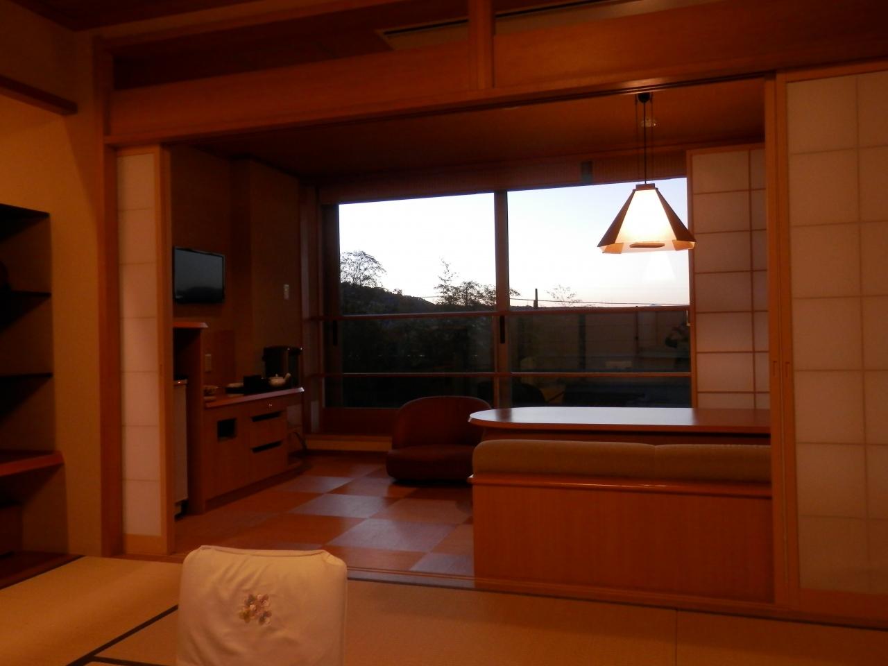 和室の奥に広いテーブル席 窓から富士山が見えます