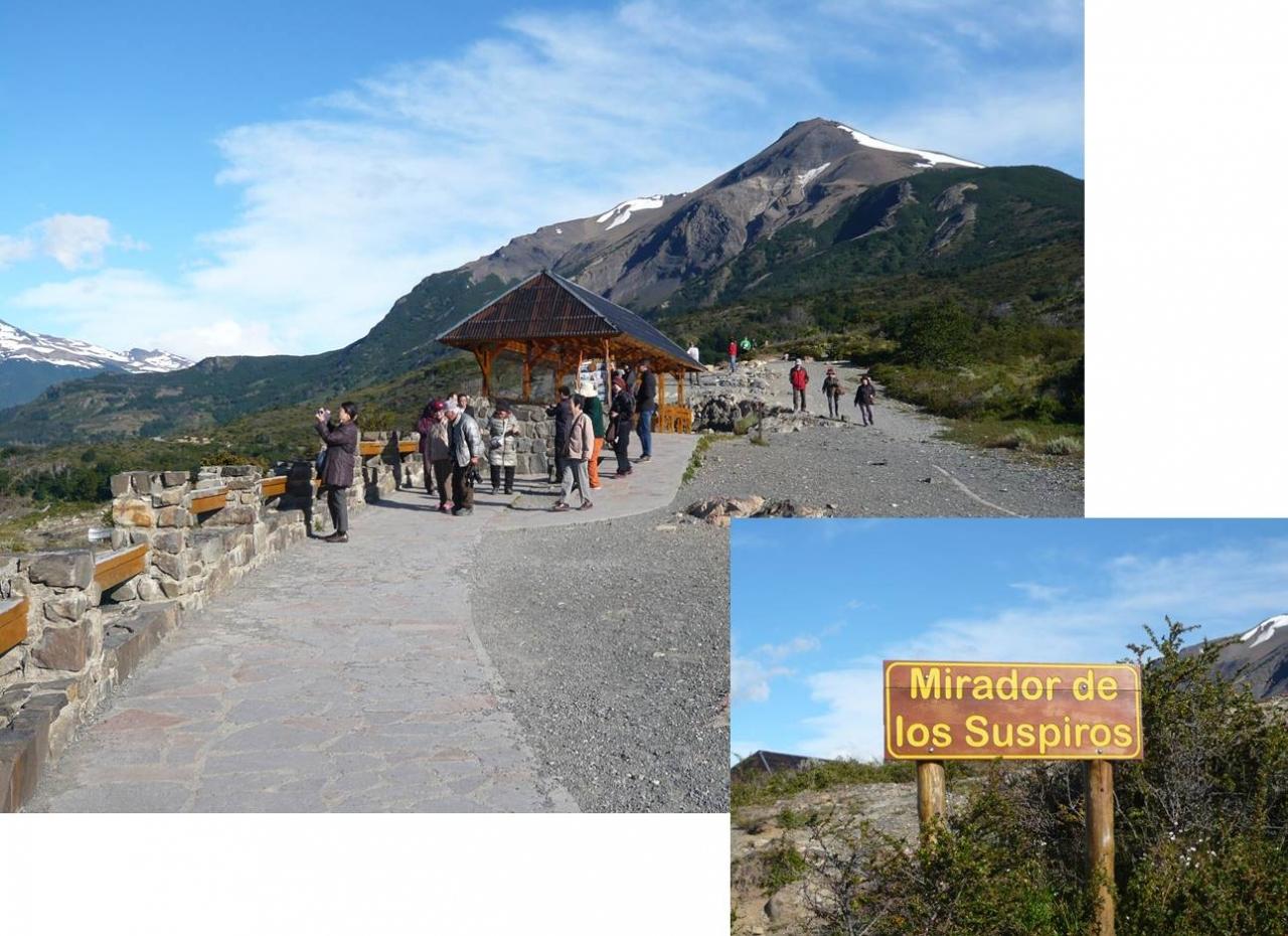 • いよいよペリト・モレノ氷河の展望台へ。<br />遊歩道は整備されており、パンフレットにはコースが3つに色分けされていて、それと同じ色がコース上の手摺りの下に丸い印で表示されていました。<br />所々ベンチが設置されていました。