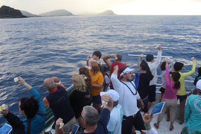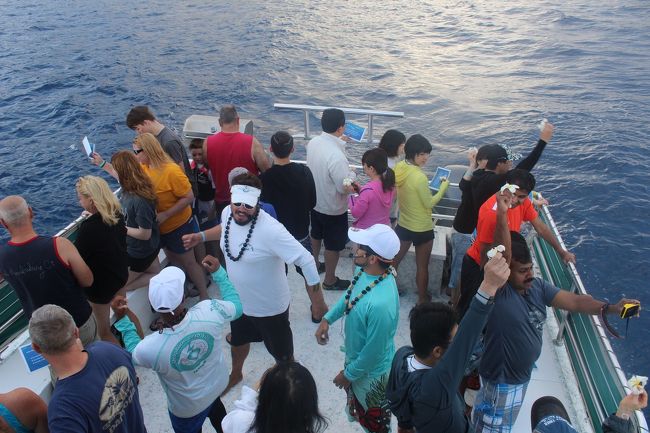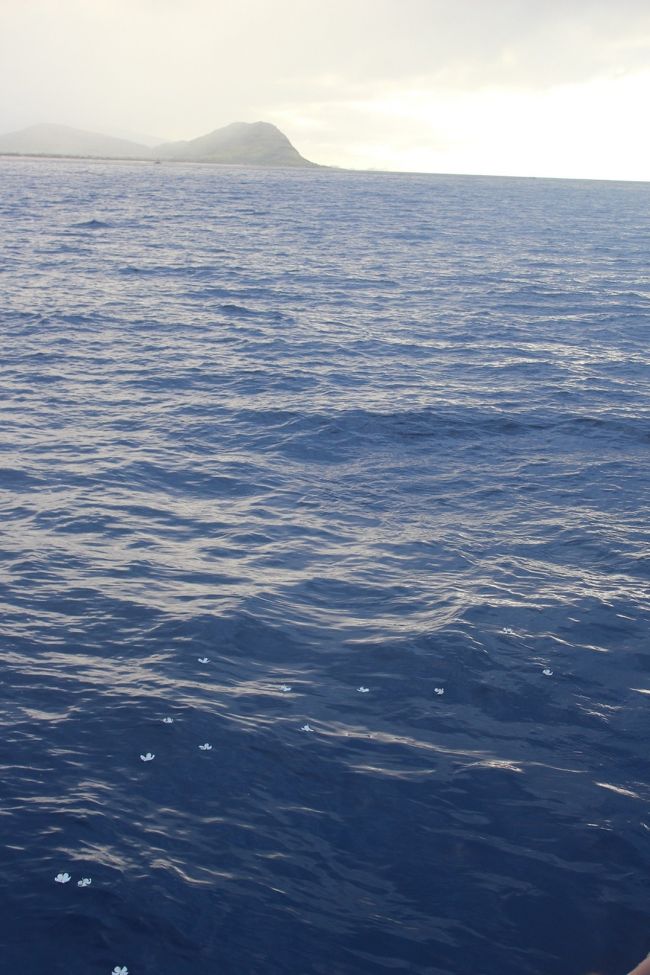 今日の旅が安全にたくさんのイルカに会えますようにという願いを込めてセレモニー。エホマイというお祈りをしてから、みんなでプルメリアを海へ捧げます。