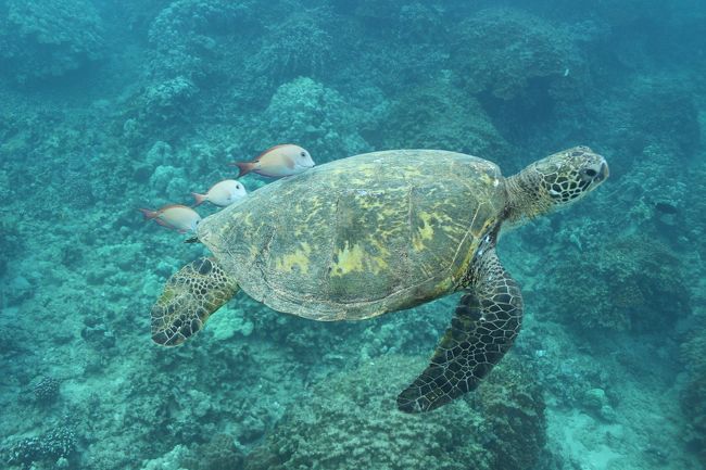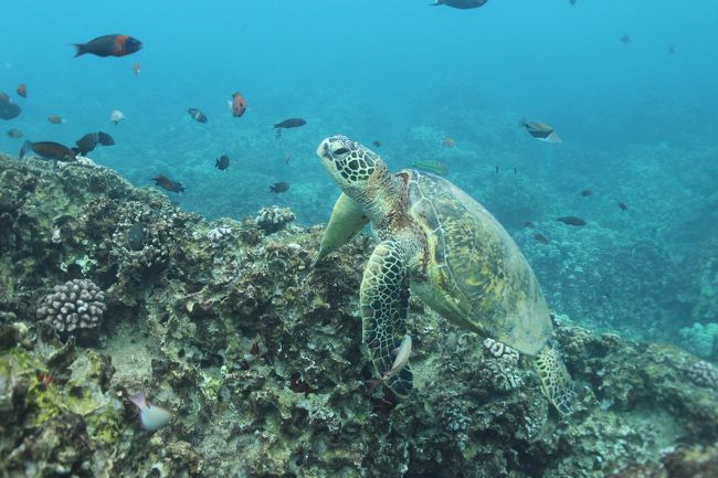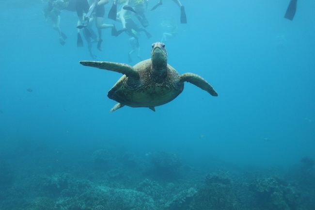 Hawaiiでは幸運の象徴のウミガメ(ホヌ)も真近で。