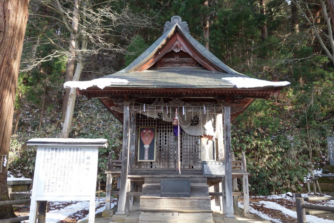 さざえ堂の境内に隣接した所にあります。社殿は桁行3間、梁間2間、入母屋、銅板葺きの建物で、中には戊辰戦争で飯盛山で自刃した白虎隊19士の霊像が安置されています。霊像は明治23(1890)年、白虎隊の墓碑を改修した際、大橋知伸(若松城下滝沢村出身の仏師)、田中治八によって製作されたものでフランス風の洋服(軍服)を着ています -