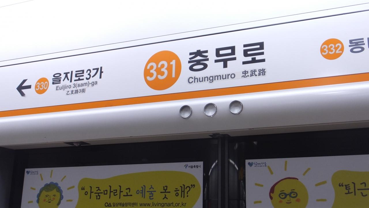 ホテル最寄りの「会賢」から4号線で2駅目、「忠武路」駅で3号線に乗換え。忠武路駅 駅