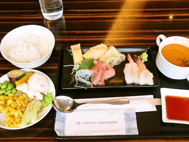 朝からまともな食事をしていなかったので、ラウンジで食事。お寿司ではなく、刺身定食風にしてみました。