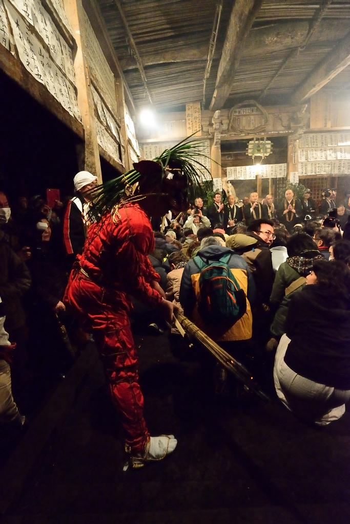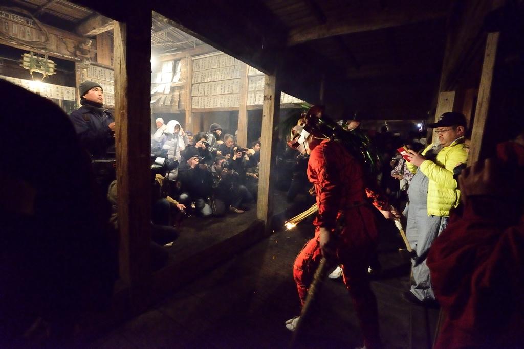 2030 見物客は鬼に松明で肩や背中を叩いてもらい無病息災を祈願します。