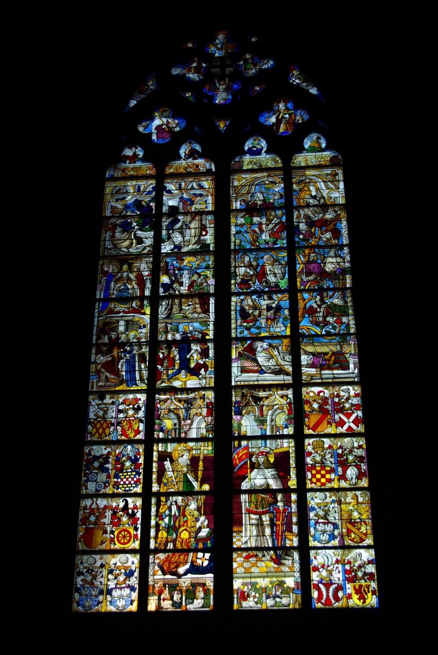 こちらのステンドグラスは、「バイエルン窓」に比べると、表情が硬いのですが、全体の鮮やかな色調とデザインの優美さがいいと思います。