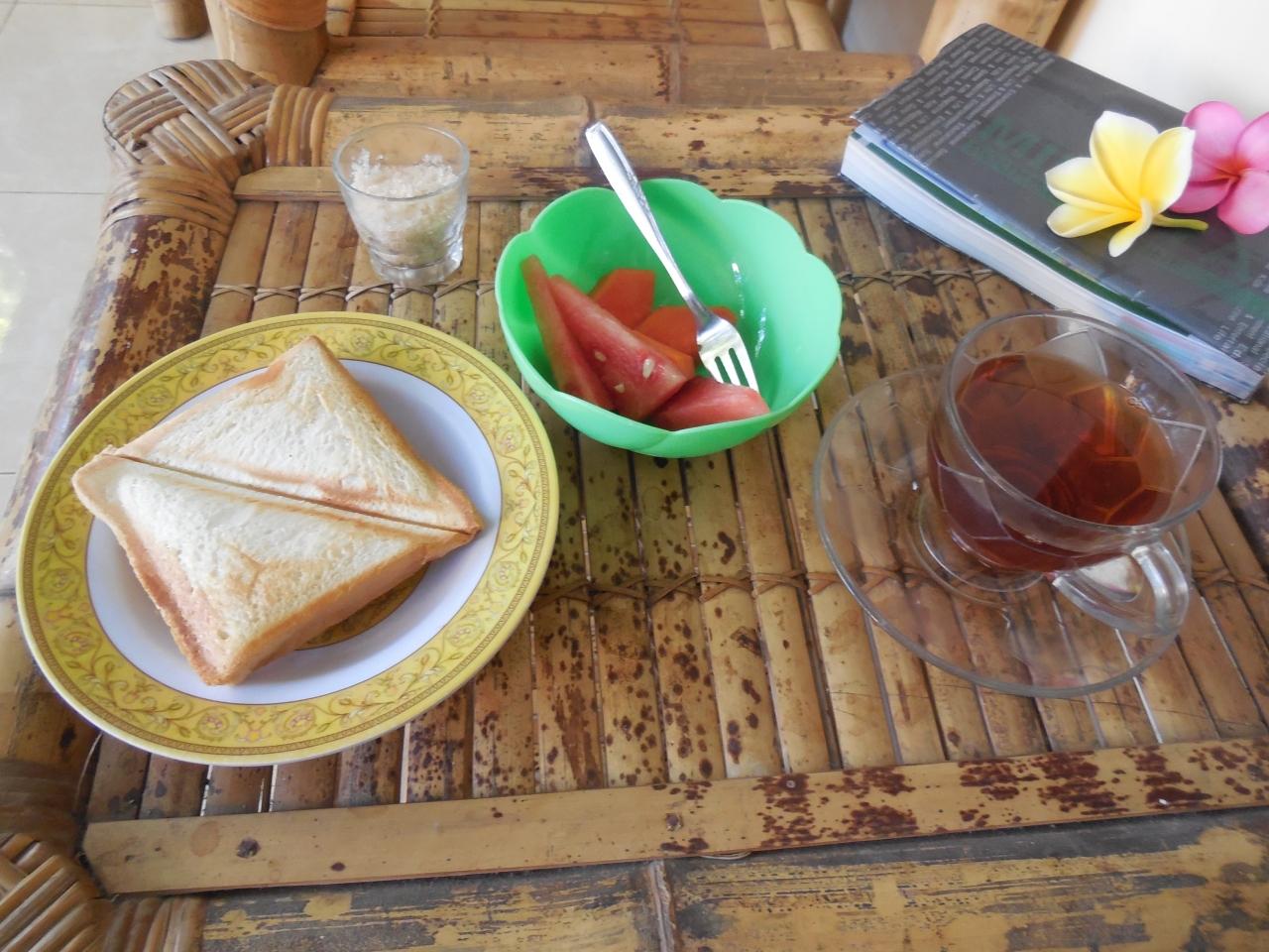ここの朝食。パンの中味はバナナか卵を選択できます。飲み物はコーヒーか紅茶。コーヒーを頼んだのに紅茶が来たのはご愛嬌。その後にここコーヒーもらいました。