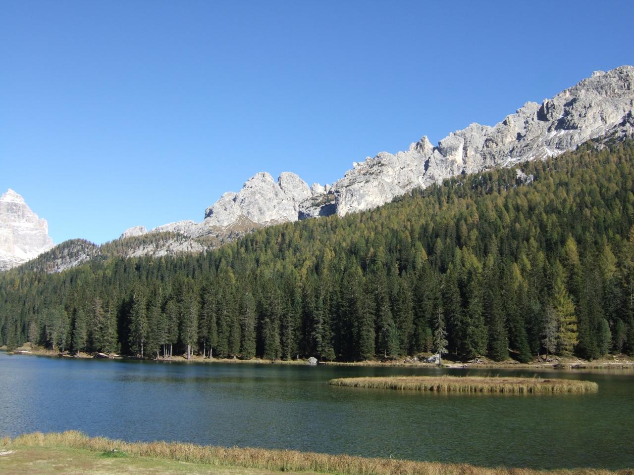 ここ ミズリーナ湖は、帰りに寄ります。車窓からトレチーメが見えています。