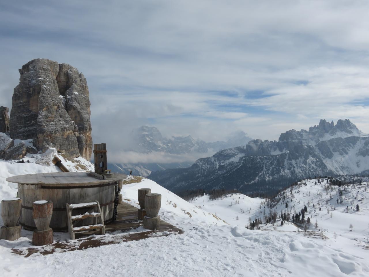 2013年の夏にジアウ峠までドライブで来た時に、アベラウ小屋から撮影したチンクエ・トッリとトファーナの絶景(*)。昨日だったらこのような快晴の写真が撮れたかもしれない。今日は、そこまでは晴れていなくて残念だ。