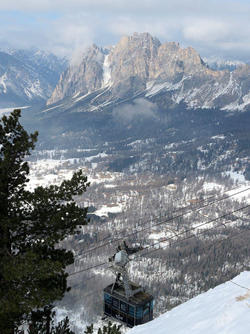 コルチナのバスターミナルから歩いて数分のところにファローリアのゴンドラ乗り場があるので、写真だけ撮りに乗って上がってみることにした。途中で別のゴンドラに乗り継ぐ必要があった。この時間帯は少し乗り継ぎに待たされた。反対側には、トファーナが屏風のように聳えているが、今日は上の方は雲に隠れて見えなかった。