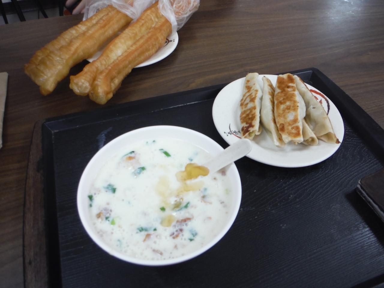 二日目の朝食 手前は鹹豆漿、豆乳に味をつけたスープのようなもの、右のは餃子みたいなもの 奥は油條、台湾流揚げパン。