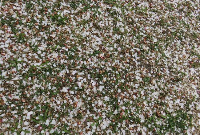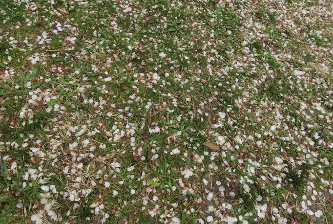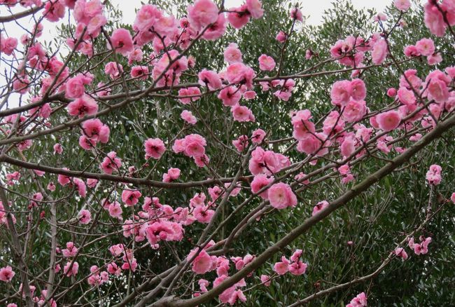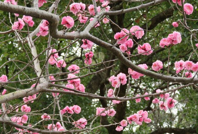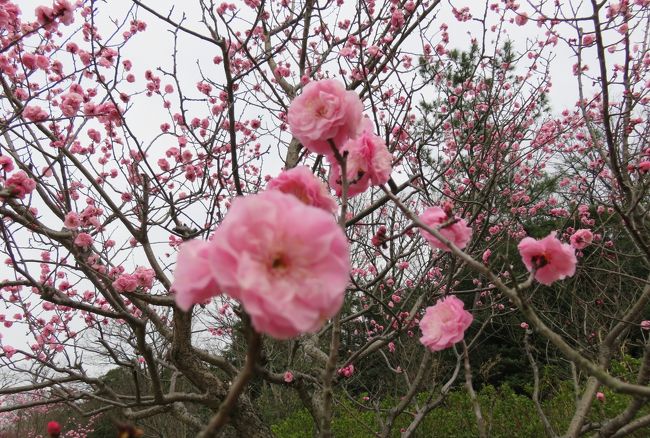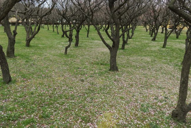 大高緑地公園の散り際の梅林の紹介です。一重の花はほとんど散って、残っていたのは八重先の梅の花でした。