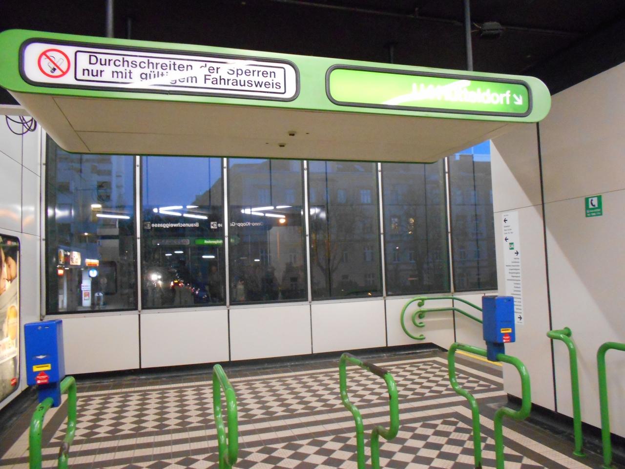 地下鉄Braunschweiggasse駅は、U4の駅です。きっぷの使用開始時は、このような青いボックスの刻印機で日付、時刻を刻印する必要があります。