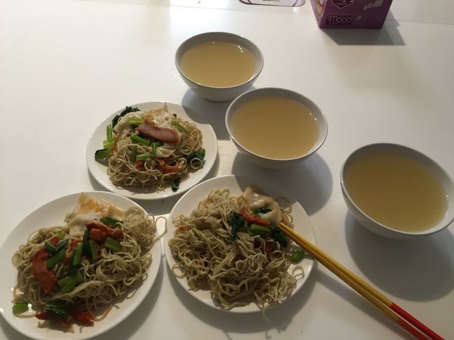 ワンタン・ミー、スープ付きをテイクアウト.日本で言う、金魚すくいの時に金魚を入れてくれる袋に入れて、ぐるぐる巻きにしてテイクアウトにしてくれる.