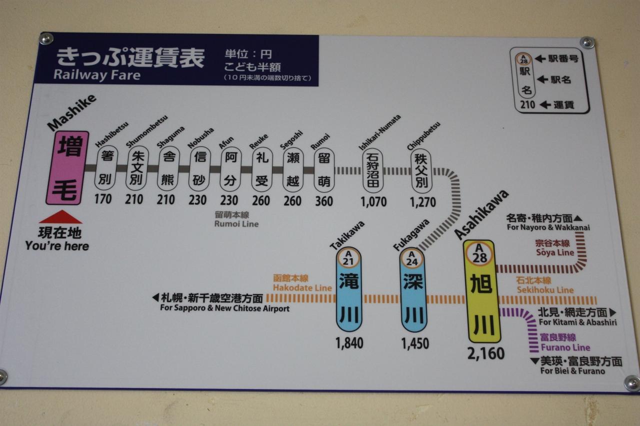 増毛駅のきっぷ運賃表。