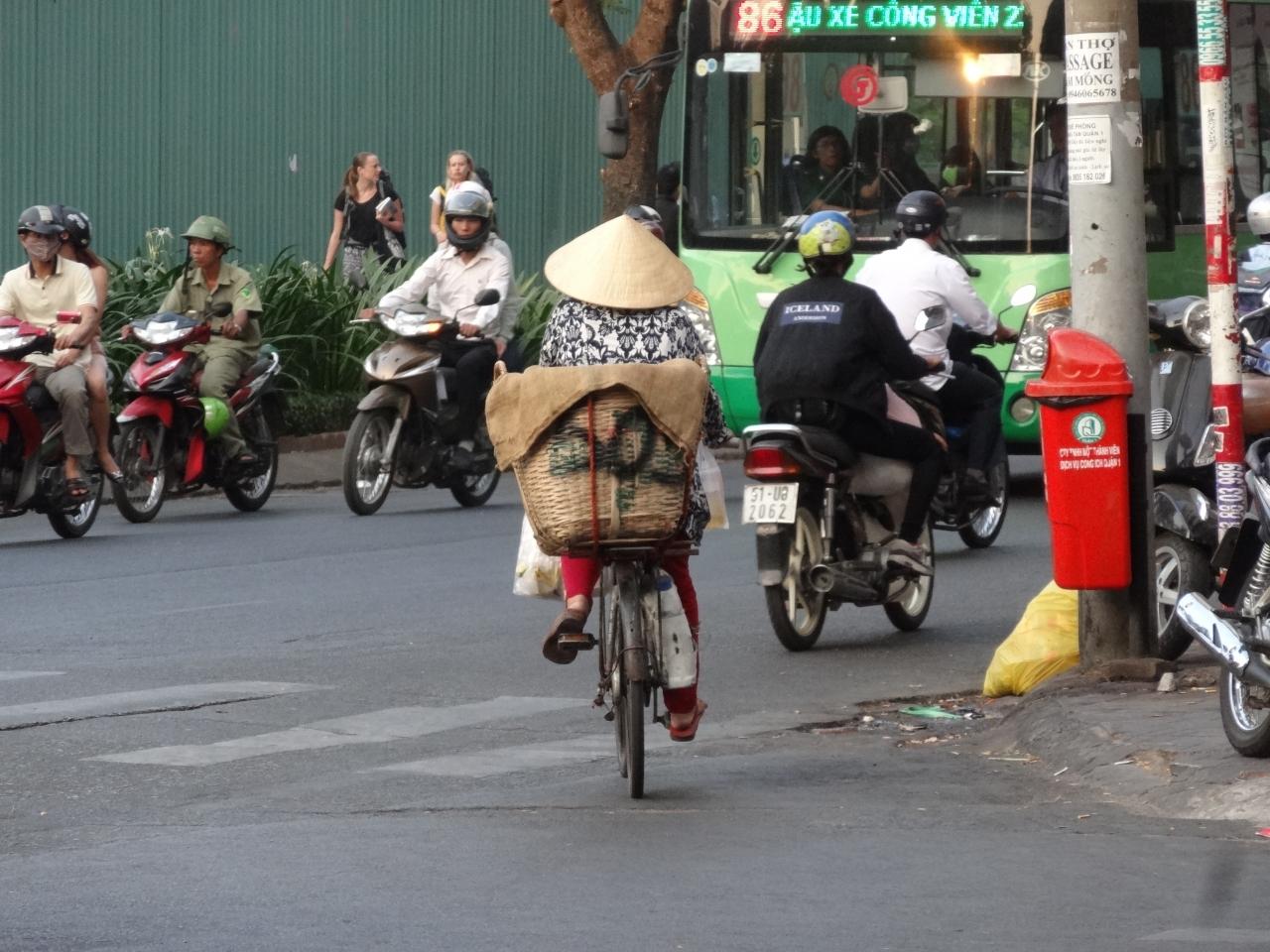 バイクがブイブイ走り回る中でも、自転車のおばさんはマイペースでゴーイング・マイ・ウェイ。
